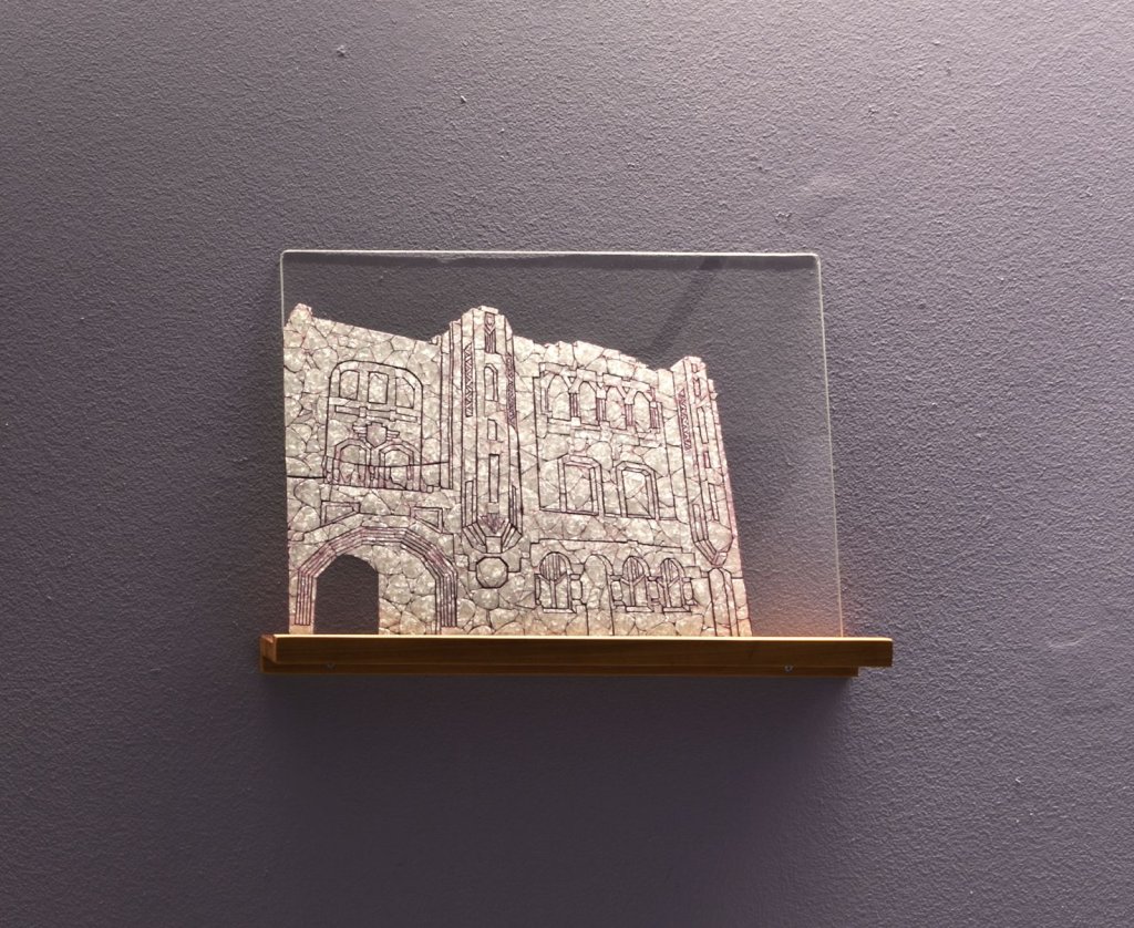 De modo minucioso, P.D. recorta pedazos de celuloide, los que compra al por mayor a modo de uñetas. Con sus ágiles manos, los iridiscentes celuloides (que evocan a otro material, el carey, proveniente de la concha de la tortuga) van completando, a modo de rompecabezas imaginarios, edificios antiguos, a veces patrimoniales. Haciendo eco a la antigua técnica novohispana del enconchado, P.D. actualiza saberes del pasado con materiales del presente.
