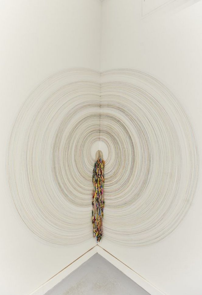 C.B. se encuentra parada frente a una esquina, de la que pende un puñado de lápices de colores de distintos tamaños. Los lápices se sostienen gracias a una estructura común, un tejido del cual se desprenden los hilos que sujetan, por separado, a los lápices. De modo pausado, C.B. toma cada uno de los colores y con ellos dibuja círculos concéntricos sobre la pared, usando como guía el largo de los hilos que los sostienen.